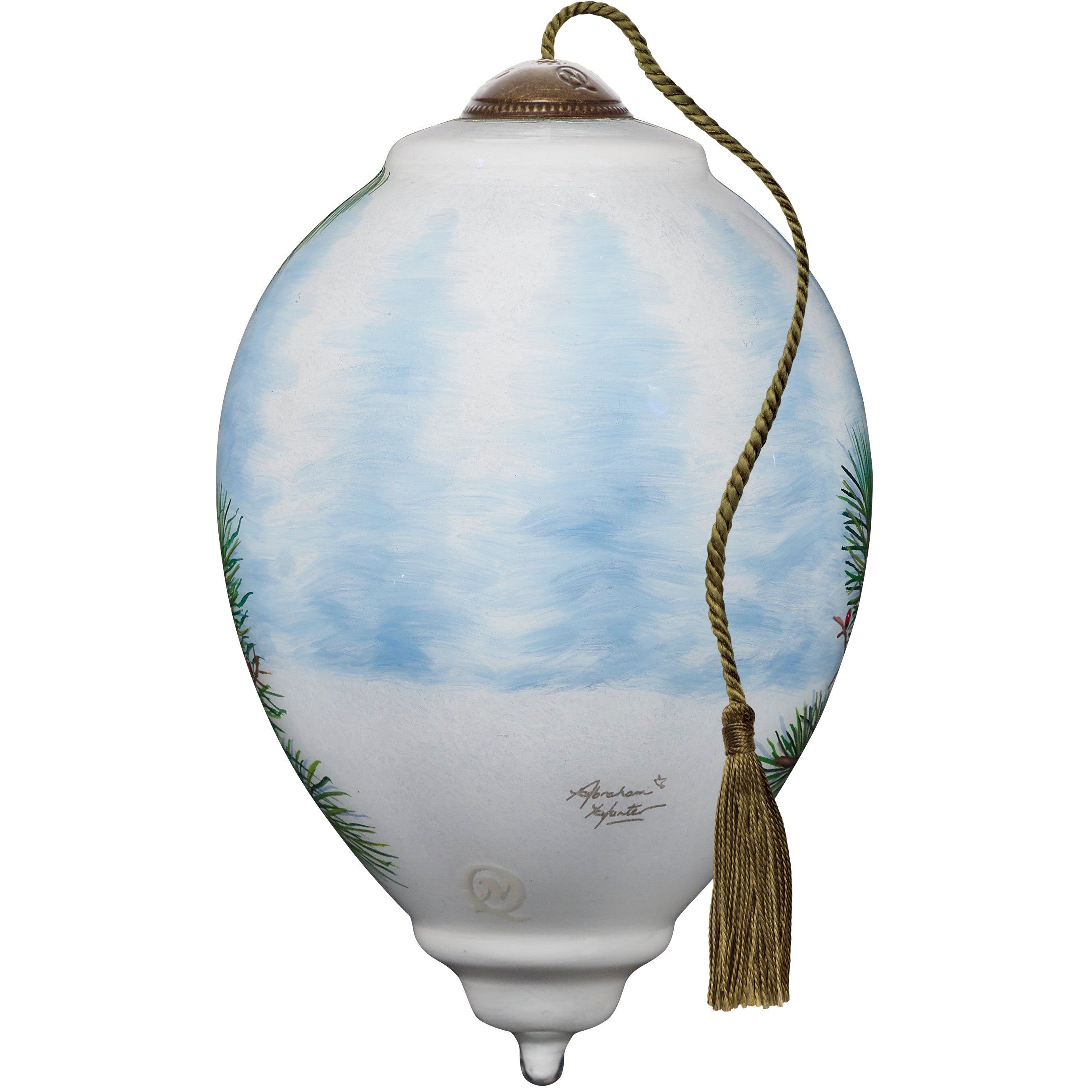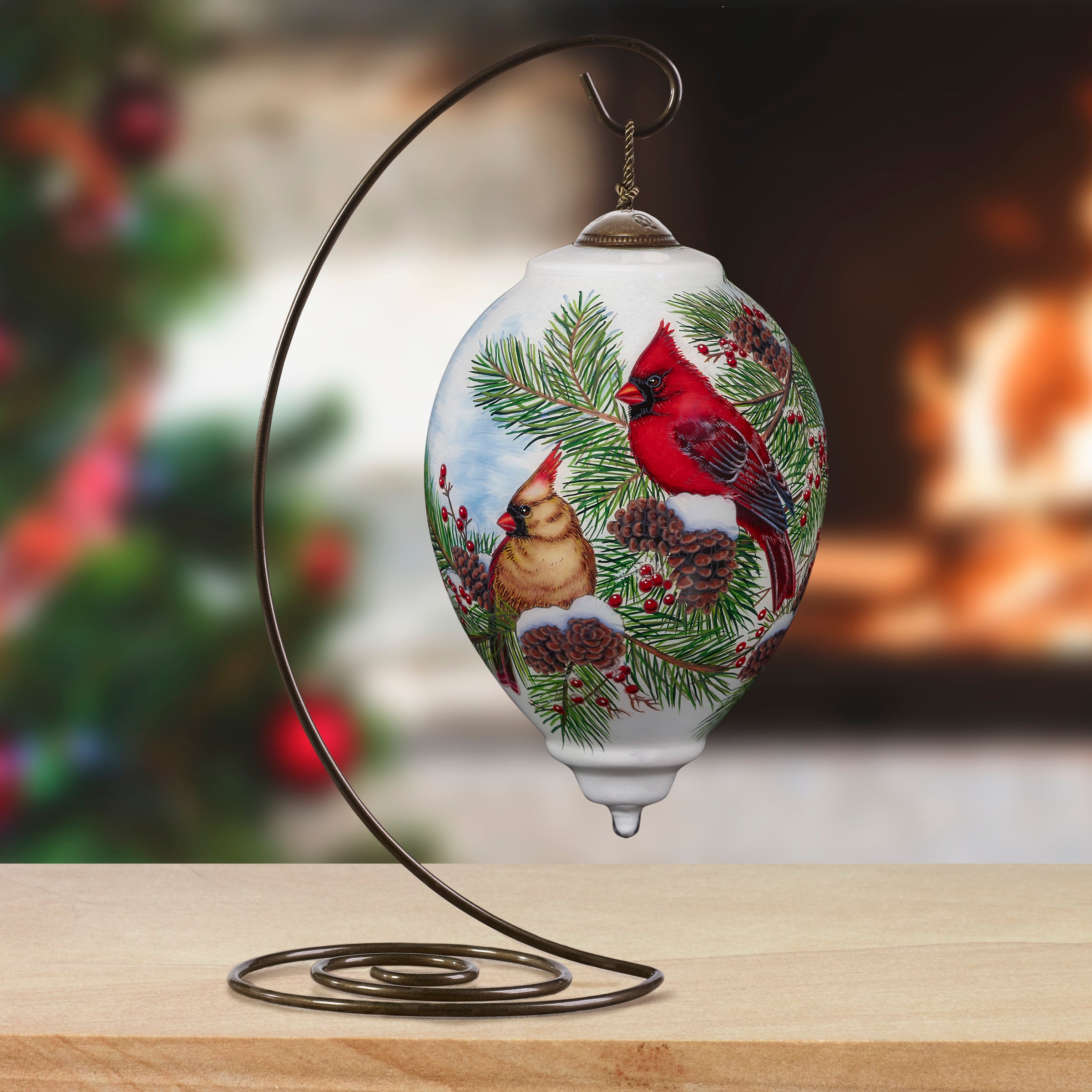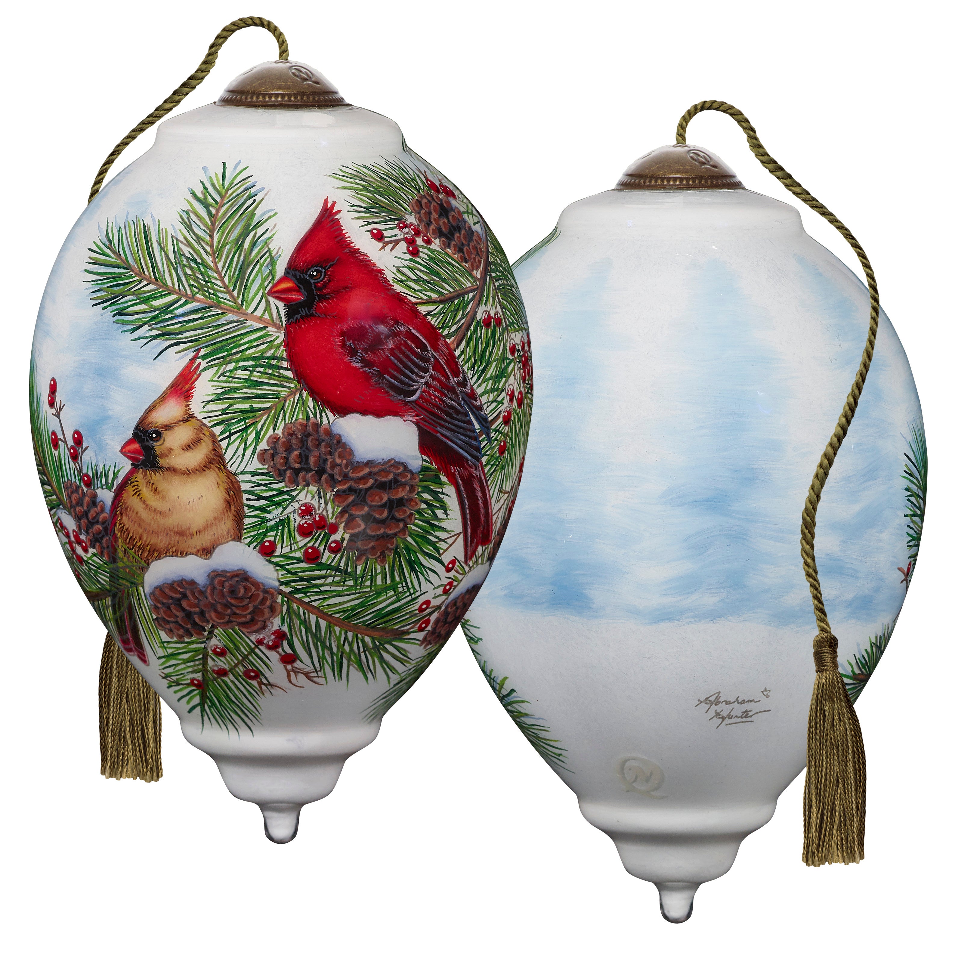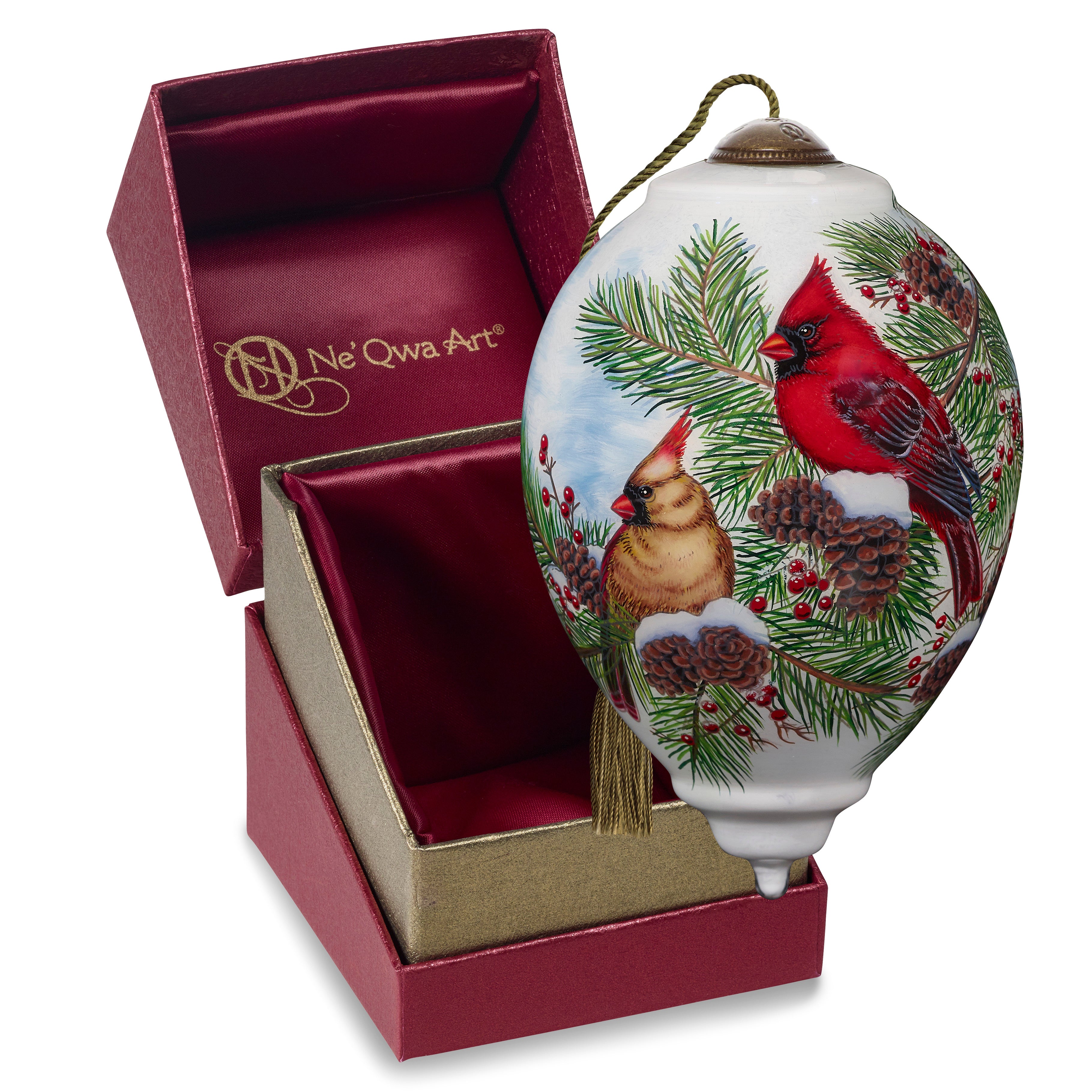 When the spirit is quiet, suddenly all of creation sings of beauty and wonder. A striking cardinal couple holds their perch among the pine boughs. They share their song to foster faith this season. Inspired by the detailed artwork of Abraham Hunter, Ne’Qwa Art artisans brilliantly re-create his beautiful birds. This ornament includes a Certificate of Authenticity and is attractively packaged in a satin-lined, keepsake gift box. This artful ornament is a perfect Christmas gift for friends, family, coworkers, or anyone who loves watching for cardinals during the winter months. It is also a great gift for birdwatchers and nature lovers. An adjustable tasseled cord allows for display on a Christmas tree or a Ne’Qwa Art ornament stand. The ornament measures approximately 5.5”H, Standard Princess. All genuine Ne’Qwa Art® ornaments and gifts are created with the ancient technique of hand-painting original art on the inside of mouth-blown glass. With meticulous attention to every detail, trained artisans use specially designed paintbrushes to re-create stunning works of original art. Make memories to treasure for a lifetime with authentic Ne’Qwa Art® glass ornaments and gifts.