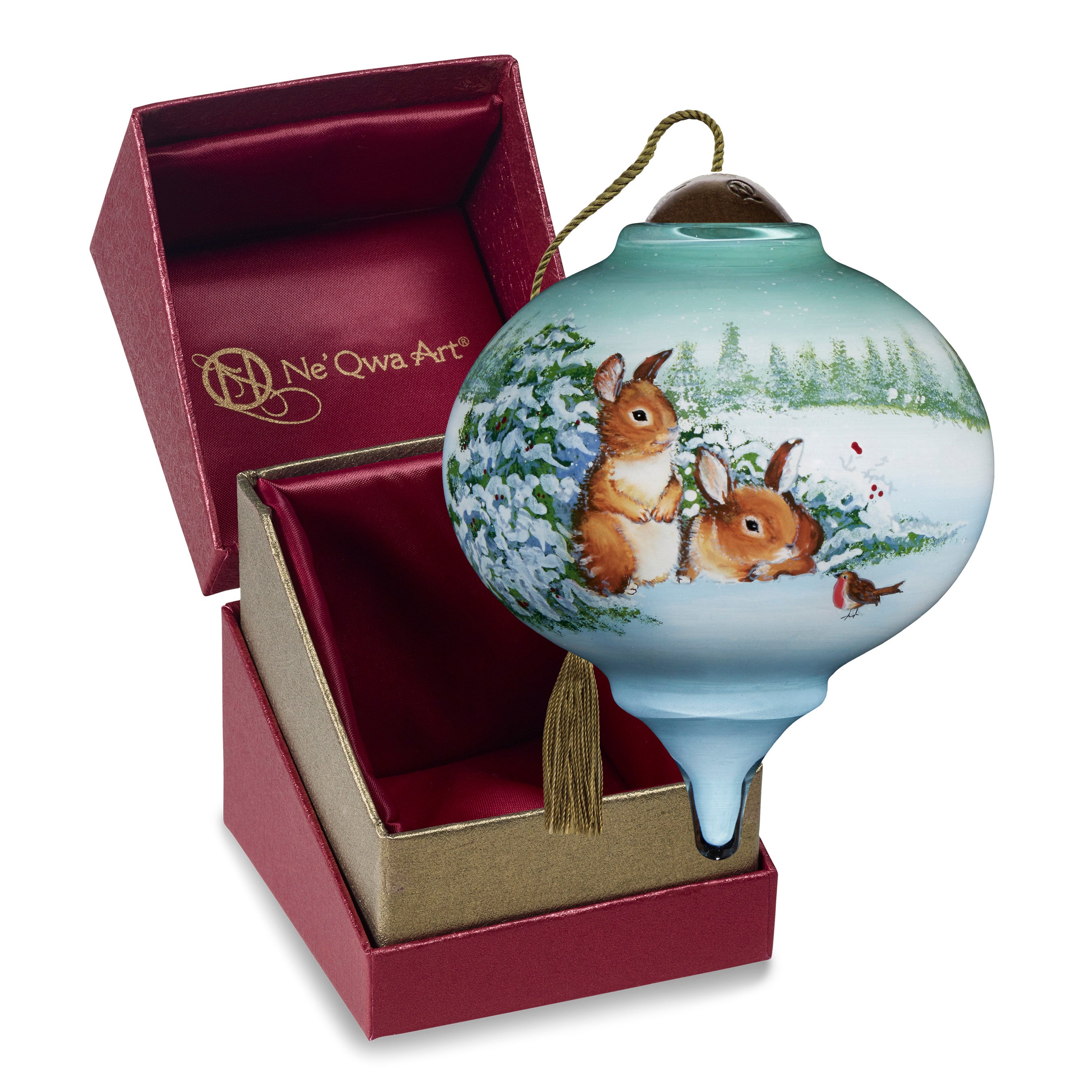 Even nature’s creatures can feel the holiday spirit within them this season. This ornament features a pair of cute and cuddly bunnies greeting a plump birdie friend as they enjoy a snowy December day. “Hoppy Christmas” appears on the reverse side. Inspired by the adorable artwork of Hazel Lincoln, Ne’Qwa Art artisans recreate the sweet nature scene for this detailed ornament. Includes a signed certificate of authenticity. Beautifully packaged in a satin-lined, keepsake gift box, this ornament is a perfect holiday gift for friends, family, coworkers, or anyone who appreciates the beauty of winter’s creatures. Also makes an excellent Secret Santa, hostess, or housewarming gift. An adjustable tasseled cord allows for display on a Christmas tree or a stand. Measures approximately 3.25”H, Petite Marquis shape.