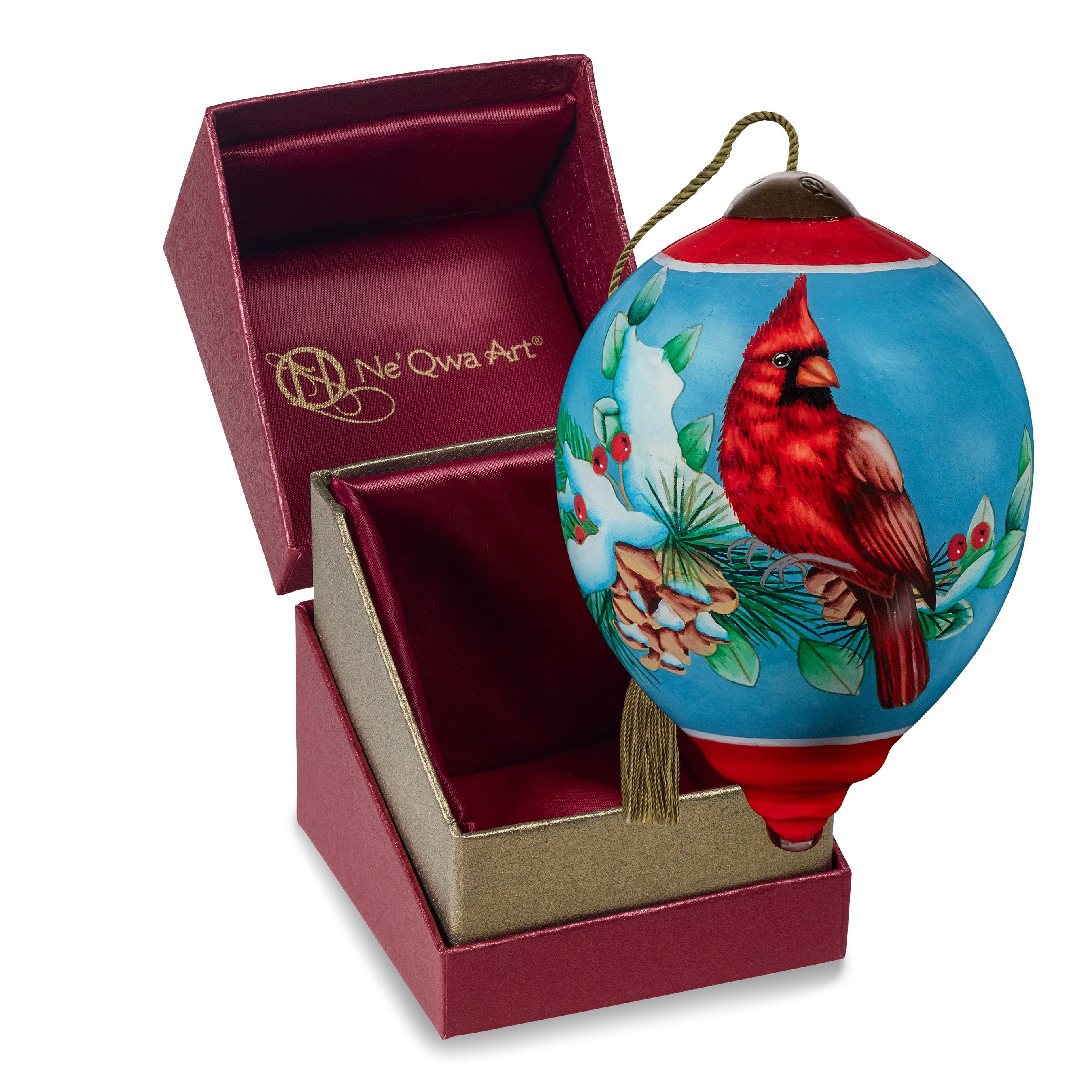 ‘Tis the season to send well-wishes and goodwill to all the world. A cheerful cardinal perches on a snowy pine bough to wish one and all a season of faith, hope, and peace. Inspired by the artwork of Nancy Mink, Ne’Qwa Art artisans re-create her peaceful scene. This ornament includes a Certificate of Authenticity. Beautifully packaged in a satin-lined, keepsake gift box, this colorful ornament is a perfect holiday gift for friends, family, coworkers, or anyone who feels uplifted by the sight of a cardinal on a snowy day. It is also a great gift for birdwatchers and nature lovers. An adjustable tasseled cord allows for display on a Christmas tree or a Ne’Qwa Art ornament stand. This ornament measures approximately 3”H, Petite Princess. All genuine Ne’Qwa Art® ornaments and gifts are created with the ancient technique of hand-painting original art on the inside of mouth-blown glass. With meticulous attention to every detail, trained artisans use specially designed paintbrushes to re-create stunning works of original art. Make memories to treasure for a lifetime with authentic Ne’Qwa Art® glass ornaments and gifts.