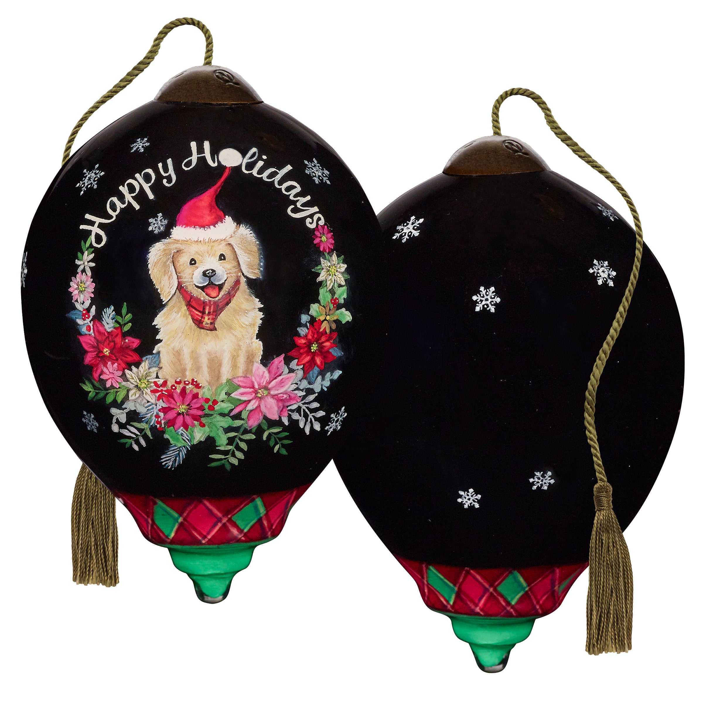 ‘Tis the season to share happy greetings with everyone you meet. A smiling pup wishes one and all the happiest of holidays. The pom-pom of his Santa hat cleverly creates the “o” in his message. Inspired by the adorable artwork of Sarah Summers, Ne’Qwa Art artisans re-create her happy Christmas canine. This ornament includes a Certificate of Authenticity and is beautifully packaged in a satin-lined, keepsake gift box. It is a perfect holiday gift for friends, family, coworkers, teachers, or anyone who loves dogs. It also makes a thoughtful hostess gift or housewarming present. An adjustable tasseled cord allows for display on a Christmas tree or a Ne’Qwa Art ornament stand. This ornament measures approximately 3”H, Petite Princess. All genuine Ne’Qwa Art® ornaments and gifts are created with the ancient technique of hand-painting original art on the inside of mouth-blown glass. With meticulous attention to every detail, trained artisans use specially designed paintbrushes to re-create stunning works of original art. Make memories to treasure for a lifetime with authentic Ne’Qwa Art® glass ornaments and gifts.